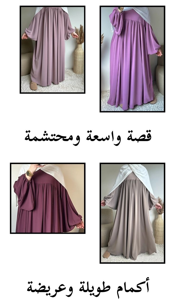 تتميز العبائة بقصّة واسعة وأنيقة التي تمنح حرية الحركة والاحتشام التي تناسب المحجبات، مع أكمام طويلة منتفخة تضيف لمسة أنوثة ناعمة.